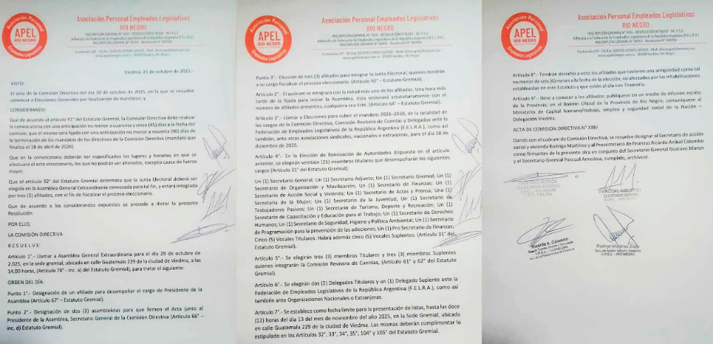 Con la correspondiente presentación ante autoridades del Ministerio de Trabajo, la comisión directiva de la Asociación Personal de Empleados Legislativos de Río Negro realizó el llamado a Asamblea General Extraordinaria con el fin de iniciar el proceso eleccionario para el período 2026-2030. Esta asamblea tendrá lugar el 29 de octubre en la sede gremial, en Guatemala 229 a las 14 hs.